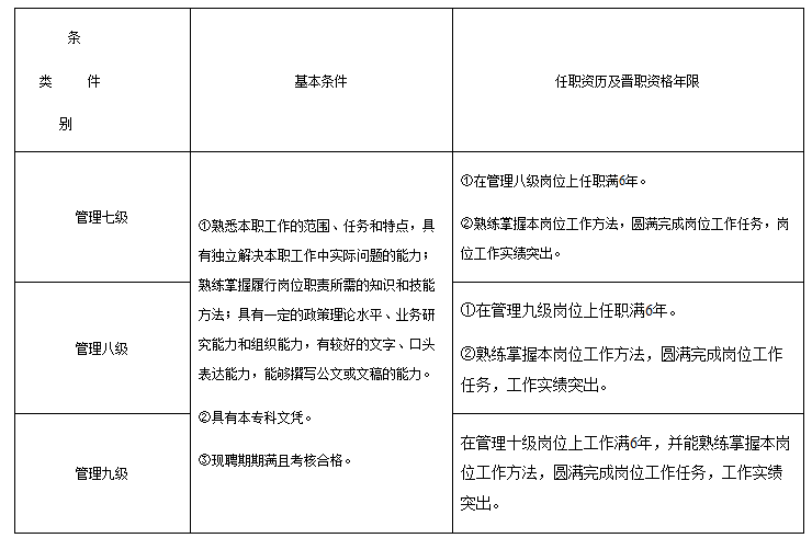 各学院、各部门: 为加强管理队伍建设,充分调动教职工的积极性,根据《关于事业单位岗位管理制度实施后有关问题的意见》(浙人社发〔2013〕106号)、《关于事业单位管理岗位部分职员等级晋升问题有关事项的通知》(浙人社办发〔2013〕53号)、《关于事业单位岗位管理制度实施后有关问题的处理意见》(温人社发〔2015〕280号)、《温州大学岗位设置实施方案(试行)》(行政〔2011〕79号)等文件精神和要求,结合学校岗位实际情况以及第三轮国聘工作,经研究,决定开展部分管理岗位职员职级竞聘晋升试点工作。现将有关事项通知如下: 一、评聘和转岗原则 1.在上级部门核定岗位数内,根据学校实际情况和事业发展需要设置岗位。 2.按照岗位管理有关规定程序进行,择优评聘。 二、申报对象 1.管理职员评聘的申报对象:现聘管理岗位的工作人员。本次管理岗位职员制的试点工作,仅针对管理岗位职级的九级、八级和七级进行。 2.转聘管理岗位的申报对象:在行政管理岗位上工作的专技、工勤人员,经过个人申请可以转岗至管理岗位。 在管理岗位上工作的专技、工勤人员需要首先进行转岗,然后才能参与后续的职员制竞聘。在管理岗位上工作的专技九级、十级人员可以申请转岗为管理八级;专技八级可以转岗为七级。在管理岗位上工作的、具有大专文凭的工勤人员,高级技工可以申请转岗管理九级;中、初级可以申请转岗为管理十级。 三、申报条件 1.坚持和拥护党的基本路线,贯彻党的各项方针政策;遵纪守法,廉洁奉公,作风正派,讲团结,以集体利益为重。 2.有较强的事业心、责任心,工作做出实绩。 3.本轮国聘聘期期满且考核合格的工作人员。 4.各级岗位竞聘基本条件、任职资历及晋职年限如下: 附 表 职员职级申报条件明细表