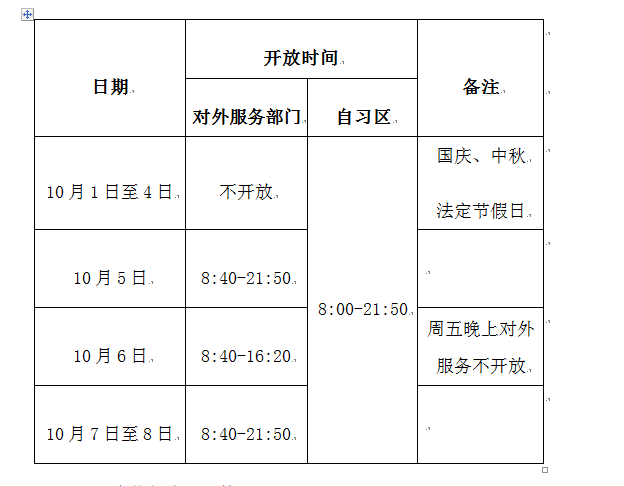 根据本学期校历表安排,图书馆国庆、中秋期间对外服务时间安排如下: