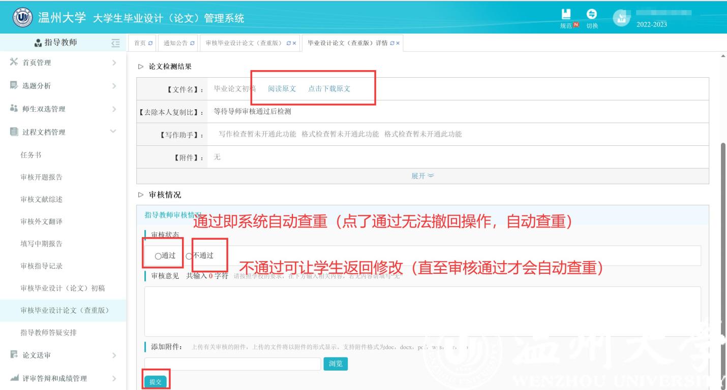 2. 系统自动查重只有一次机会。(查重版)论文没有修改完成之前,指导老师应该选择“审核不通过”,学生原地返回修改,直至修改完成,老师再“审核通过”。指导教师审核通过后,系统才会自动查重。请注意,如果老师在学生完成修改之前误操作“审核通过”将无法修改!